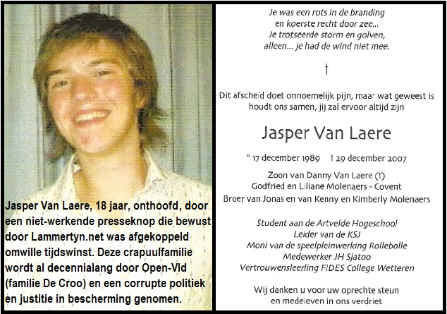 Is er het illegaal wegmoffelen van het rijk gevulde strafblad van de hoofdverantwoordelijke in dit moordverhaal, nl. Koen Lammertyn. Dit “krapuultje”, wat ook zijn strafblad getuigt (en waarvoor papa Marc Lammertyn ook wel bekend stond nl. zuipen en vechten, telkens door de lokale “slijmpolitie” door de vingers gezien), die zelfs nooit als zaakvoerder mocht aantreden door zijn rijk gevuld strafblad, maakt dat de OPEN-VLD, en in het bijzonder de familie De Croo, jarenlang illegale en strafbare feiten onder de mat veegde waardoor deze familie vrijelijk zijn gang kon gaan. Waarbij de liberalen illegaliteit legaal maakt. Wat duidelijk machtsmisbruik is en strafbaar. De overheid (Lees : liberale bende van De Croo) gaat hier opnieuw in de fout want Koen Lammertyn mocht nooit zaakvoerder geworden zijn. “Wij mogen meer” was dan ook de leuze van Lammertyn. U moet begrijpen dat de “hoge” financiële bijdragen door Lammertyn aan de politieke partij OPEN-VLD duidelijk maakt dat, tegenover de ernst van de feiten, kapitaal een “bevrijdend” gegeven was.