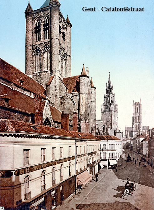 De Cataloniëstraat was oorspronkelijk een nauw straatje tussen het Belfort en de toen nog Kleine Korenmarkt aan de St.-Niklaaskerk. Deze kerk domineerde de omgeving van de Cataloniëstraat. De Cataloniëstraat versmolt halverwege 19e eeuw samen met de Korte Ridderstraat (traject Stadshal -Gouden Leeuwplein) aan het Belfort tot de St.-Jansstraat die doodliep aan de Nederschelde. De Kleine Korenmarkt aan de westgevel van de St.-Niklaaskerk was de officiële Gentse fruitmarkt. Op de hoek van de Veldstraat was de “Kapel der Fruiteniers” waar boeren de mis konden bijwonen vooraleer de markt te doen.