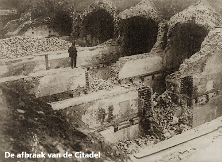 13 juni 1910. Men is begonnen aan de slechting van de citadel. De magazijnen die op de koer stonden zijn bijna geheel afgebroken. Van de vestingsgordel zal men twee delen van 50 meter afbreken rechtover het “Zwitsers Lusthuis” en het “Museum van Schone Kunsten”. Een stuk van ongeveer 100 meter met de grote ingangspoort blijft staan.