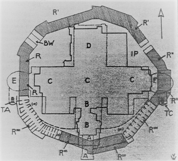 b ) het gearceerd gedeelte van de “ring” (R’), grotendeels gewezen soldatenkamers; behouden en natuurlijk aangepast aan de noodwendigheden werden : de monumentale ingangspoort (IP ) en een voor de Plantsoendienst ingerichte berg-en werkplaats (BW) ; de achterkant ervan paalt aan de zg. grot met de 3 gaten