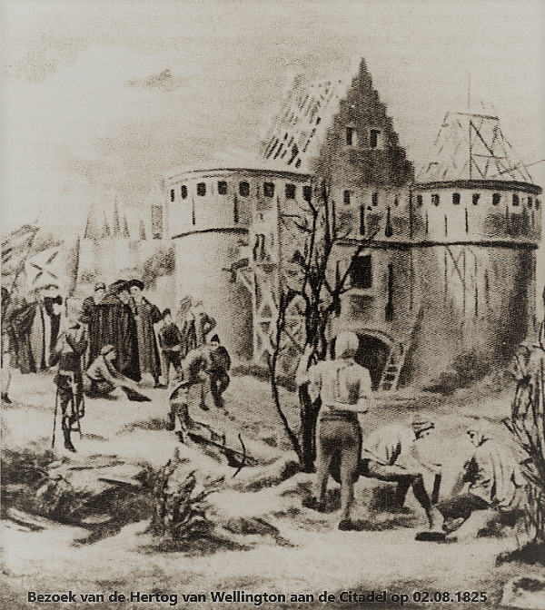 Het is het bezoek dat op 2 augustus 1825 plaatsgreep dat Gondry en zijn maats op het doek penseelden. We zien hoe luitenant-generaal Gey van Pittius post gevat heeft op de plek waar voorheen het Montereyfort preikte. Vergezeld van burgemeester de Raveschoot voert hij een gesprek met Wellington. Op een paar passen van het groepje mogen we de aanwezigheid vermoeden van schepen Van Wambeke en industrieel de Smet de Naeyer. Op de achtergrond wacht de postkoets waarmee Wellington zijn reis zal voortzetten. Ruim 8 jaar zwoegde men met man en macht aan de bouw van het gigantisch fort. Wat zeggen wil dat het “voor het gebruik” gereed kwam op de vooravond van de uitbarsting van de Omwenteling van 1830.