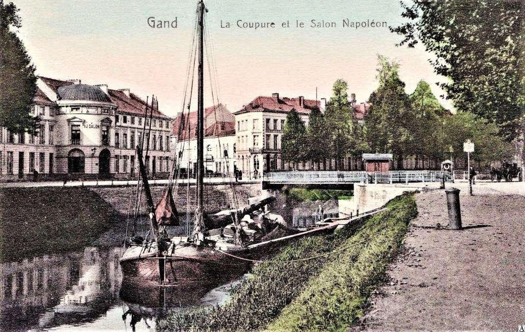1 juni 1842. Naar we vernemen is de inhuldiging van de schone estaminet of guinguette, welke de hovenier-bloemkweker Francies Spae naast zijn woning op de wandeling van de Coupure en de Rosemarijnbrug alhier in de vorm van een rotonde heeft laten bouwen, op aanstaande zaterdagavond bepaald en zullen dertig muzikanten de toeloop van de wandelaars naar het paviljoen of rotonde der Coupure aanlokken. De titel van Salon Napoléon, die men aan de nieuwe estaminet heeft gegeven, zal ongetwijfeld menig oude knorrepot van het groot leger aansporen om de gedachtenis van hun afgod met goede Gentse uitzet te begieten