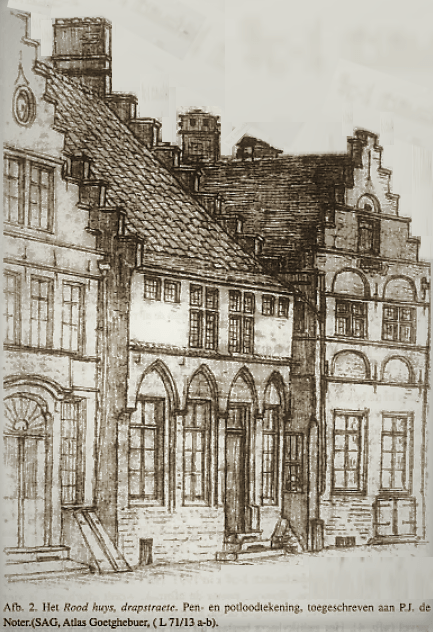 In de bewaarde notarisacte werd het huis gesitueerd “tusschen d’achterpoorte van de brauwerye De Swaene en de … dhoirs vanden advocaet Dubois”. De Swaene, waarvan nu enkel de gevel nog bestaat als gevolg van de hogervermelde hotelbouw, ligt langs de Korenlei en was eertijds toegankelijk langs een achterpoort in de Drabstraat. De brouwerij stond voor een deel op het erf van de reeds genoemde familie De Mey. De buren aan de rechterkant waren de erfgenamen van advokaat Frans du Bois, die het Rode huis in hun bezit hadden. Het pand werd verkocht aan Lotu voor 550 lb. gr. vlaams. Twee pistollen wisselgeit werden bezorgd aan “’s vercoopers domestiquen”.