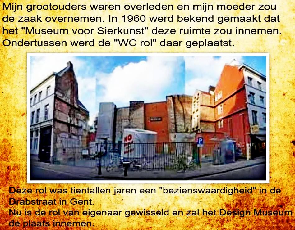 Jacqueline woonde tot 1960 op de plaats waar de WC-rol stond in de Drabstraat. Ze maakte deze collages voor ons. “Mijn grootouders hadden daar een kruidenierswinkel en wij woonden daar ook. Toen mijn grootouders overleden waren, wou mijn moeder de zaak overnemen maar dat kon niet want het museum zou bijbouwen op die plaats. Maar van 196O tot 2022 is daar niet veel gebeurd, alleen de rol kwam er. In 2024 zal het een gans ander uitzicht krijgen.