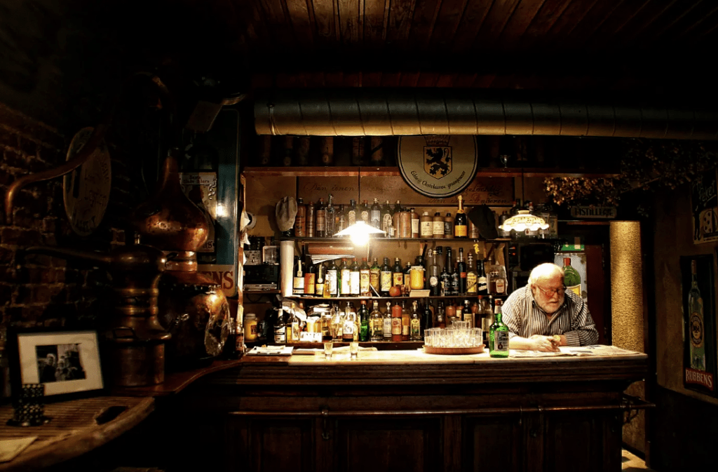 Meer dan 200 soorten jenever worden aangeboden. Zelf ligt hij ook aan de basis van verschillende jenevers, hier in zijn café “geprepareerd”. Al eens een peperjenever geproefd? Een spreuk in het café is dan ook een logische verwijzing naar zijn klanten: “Den Ienen Mensch es mier Dreupelachtig dan Den Anderen”. Maar er is altijd wel een jenever die je lust dus … best een geluk dat de tram hier halt houdt aan het Gravensteen!