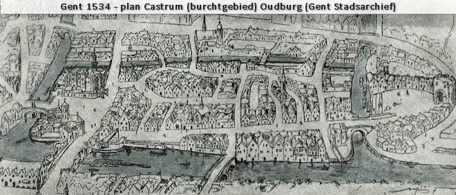 Op onderstaand plan dd. 1534 zie je het Oudburg castrum of burchtgebied met links centraal het Gravensteen en aan de overzijde van het plein de St.-Veerlekerk. Rechts merk je de Grauwpoort.