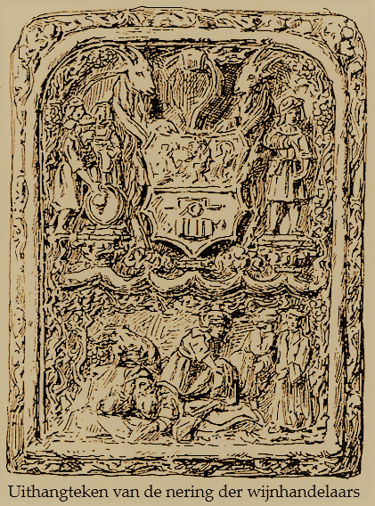 Op 24 november 1897 stelde Ernest Lacquet in de rubriek “Beeldhouwwerken -Museum van Stenen Voorwerpen (in de ruïnes van de St-Baafsabdij) – XVIe eeuw”, een fiche op over het “Uithangteken van de Nering der Wijnhandelaars”. Het huis in de Hoogpoort nr. 30 herbergde in 1540 de nering der wijnhandelaars die eigenaar was van dit gebouw dat de naam Perceval droeg. De gevel was versierd met een uithangteken dat bewaard wordt in het Museum van Stenen Voorwerpen in de ruïnes van de St-Baafs-abdij. Het is een Balegemse steen van 1.35 m breed en 1.50 m hoog, gesculpteerd in de XVIe eeuw.