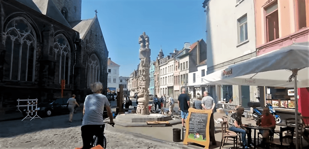 Op ’t Sint-Jacobsplein te Gent keunde ’t standbeeld ter îere van Karel Waeri vinden. In het beeld zitten de thema’s van zijn liedjes verwirkt: (slaven)arbeid, bloedbanden, verbondenheid,… Het beeld, dat eigenlijk meer ne zuil es, wierd gemoakt deur Walter De Buck.”