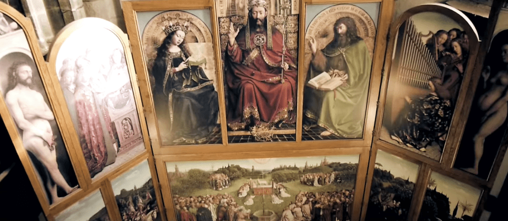 Waar is het paneel van de “Rechtvaardige Rechters”? Een zoektocht die sinds 1934, het jaar van de diefstal, niks heeft opgeleverd. Het paneel van “Johannes de Doper” werd hierbij ook ontvreemd maar achteraf wel terggevonden. Wie de details wil kennen wordt het boek “Het Lam Gods, Bewonderd en gestolen” aanbevolen. Het is een werk van Harry De Paepe – geschiedenisleraar en auteur – en de Gentse illustrator Jan Van Der Veken in samenwerking met de Stad Gent ter gelegenheid van het Van Eyckjaar 2020.