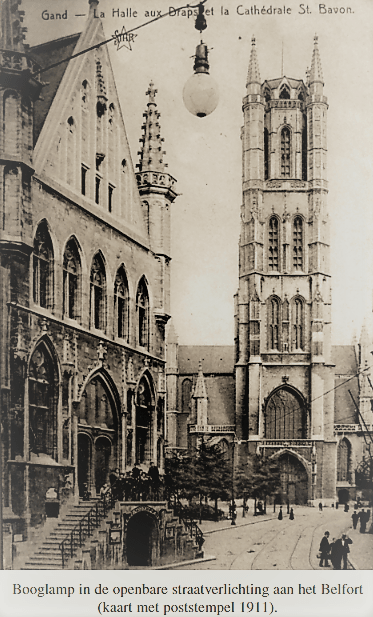 Mooi gezegd … maar niet helemaal juist. Die stap werd te Gent en in andere steden gezet, niet enkel door de opkomst van stabiel gas gloeilicht, maar ook door elektrisch licht. Misschien wel de allereerste relatief grootschalige installatie voor elektrische verlichting kwam er al in de jaren 1870 in de constructiewerkhuizen Carels,waarvan de fabrieksgebouwen tussen de Sint-Salvatorstraat en Dok-Noord ons nog als imposante getuigen overblijven. Het zal wel geen toeval zijn dat het precies deze grote fabrikant van stoommachines was die in deze ontwikkeling van de techniek het voortouw nam. De nodige energie werd immer opgewekt door zijn machines.