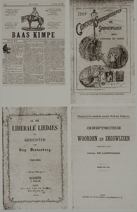 Sindsdien zijn er vele liedjes en volksblaadjes, vooral in tijden van kiezingen, in het Gentsch dialect verschenen. Noemen wij onder de liedjes deze van N. Destanberg*. Het berucht liberaal spotblad “Baes Kimpe” *werd grotendeels in ’t plat Gents geschreven en verried een flinke pen. Lodewijk De Vriese en Juliaan De Lantshere hebben letterkundige beschouwingen over het Gentsch dialect beoefend. “Wij vinden er een aardige proefstuk van in een niet minder aardig boekje, getitteld: