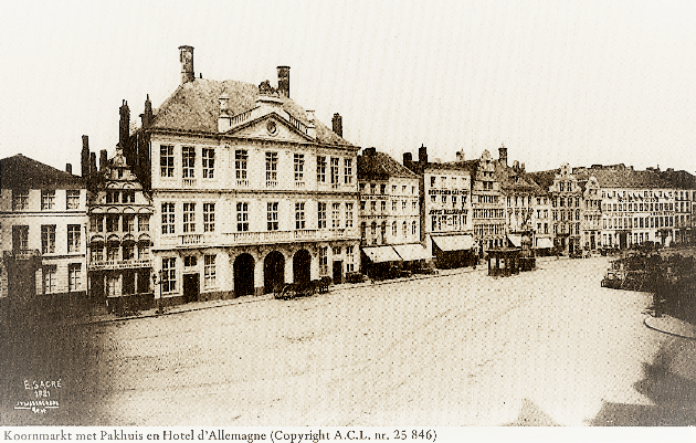 De Korenmarkt was het verkeersknooppunt bij uitstek. De “Wegwijzer” van 1872 beschrijft dat er 3 diligentiediensten op de Korenmarkt vertrokken. Enkel op vrijdag reisden de voermanswagens en diligentiën af, de eerste om 13u, wat een indrukwekkend zicht gaf.