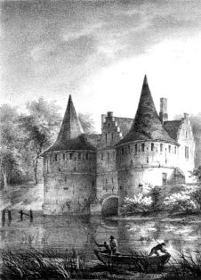 Een inscriptie, in reliëf gebeiteld in twee blauwe stenen, geplaatst aan de buitenkant van het hoofdgebouw met trapgevel, herinnert aan de strijd met Keizer Frederik III in 1488: