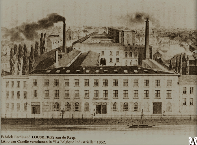 De fabriek Lousbergs was gevestigd op de Reep in het gewezen klooster de Kapucinessen. De fabriek had een ingang op de Keizer Karelstraat sedert 1840. In 1859 telde deze fabriek 2400 werknemers. F. Lousbergs, geboren te Gent op 31 augustus 1999, behoorde tot de groep personen die meer dan 2000 fr (50€) belasting betaalden (1858: 3029 fr (75€)) en was aldus verkiesbaar voor de senaat. In tegenstelling echter met de andere verkiesbaren lagen al zijn bezittingen echter in Gent. Op 1 september 1859 komt Ferdinand Lousbergs te overlijden. Hij wordt begraven op het Campo Santo te Sint-Amandsberg (graf sectie F nr. 80). Bij testament schonk F. Lousbergs aan het Bestuur van de Burgerlijke Godshuizen van Gent een stuk grond met een waarde van 65000 fr (1612€) en een som van 400000 fr (9916€) voor de bouw van een gesticht bestemd voor gebrekkige of oude textielarbeiders. Na enkele betwistingen werd het legaat bij K.B. van april 1861 goedgekeurd. Het gesticht werd gebouwd naar het plan van architekt Pauli. De laan werd in 1864 Lousbergslaan genoemd.