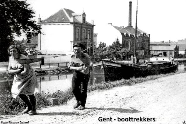 We bevinden ons op het Lievekanaal van Brugge naar Gent. Een schippersvrouw staat aan het stuur van een zwaar beladen schuit terwijl de schipper de boot met een touw vooruit trekt.