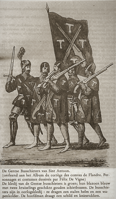Deze schuttersgilde van St.-Antonius nam aanvang in 1488 aan de Akkergemvest (Einde Were). Vlak na het mislukt beleg dd. 8 juli 1488 door Keizer Frederik III en zijn zoon Maximiliaan van Oostenrijk, waaraan we de oprichting van het Rabot te danken hebben, mochten de “kannoniers” zich verenigen uit dankbaarheid voor hun duchtig verweer waardoor het Duitse leger de strijd moest staken.