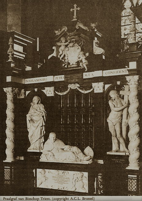 Antoon Triest kwam te overlijden op 28 mei 1657 op 81-jarige leeftijd. Zijn grafmonument in St-Baafs werd gebeiteld door Jéröme Duquesnoy. Zoals gebruikelijk werd hij begraven met zijn staf en zijn ring. Althans, dat werd gedacht. Toen in de 20e eeuw zijn rustplaats bleek ingevallen, werd de lijkkist geopend en … in zijn hand hield hij een houten staf en rond zijn vinger (of wat er nog moest voor doorgaan) zat een ijzerdraad met 2 stukjes glas in.
