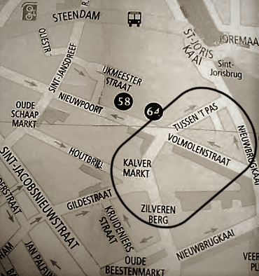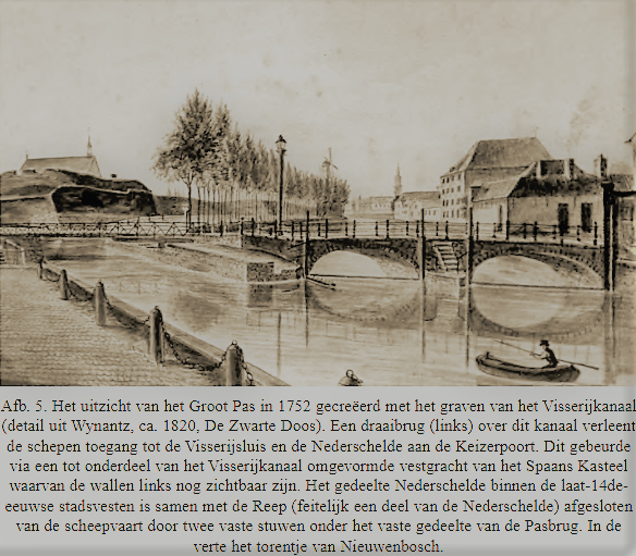 Klein en Groot Pas maken “Tussen ‘t Pas”. Nu wordt het duidelijk. De eigenaardige benaming Tussen ‘t Pas, een in 1942 opgeviste oude volksnaam, is te verklaren doordat naast dit Groot Pas, de hoger vermelde kleine constructie over de Sint-Jansgracht bleef bestaan. Dit “oude” Pas werd mettertijd “Klein Pas” genoemd. Tussen deze grote en de kleine Pasbrug had je dus … “Tussen Pas(sen)”. De (correcte) meervoudsvorm werd echter niet gebruikt. Officieel heet het er nogal misleidend “Tussen ‘t Pas”.