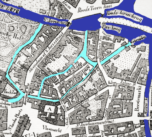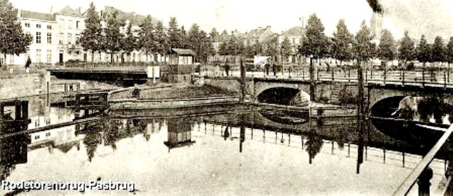 De Leie die toen aan de Pasbrug gekomen in twee werd gesplitst. De Pasbrug is de stenen brug waar het water van de Leie door een balksluis, “’t Pas”, kan worden opgehouden. De Rode Torenbrug was een houten draaibrug. De vermelding in de stadsrekeningen van “brug ‘over t Pas” in 1330-1331 en 1332-1333 wijst erop dat niet de brug zelf “Pas” genoemd werd. Maar wat dan wel?
