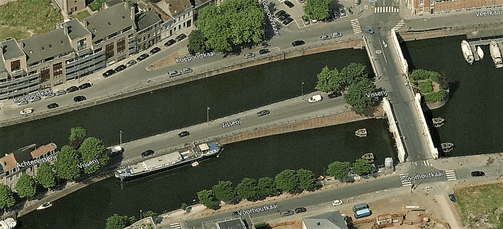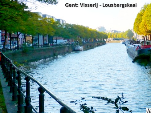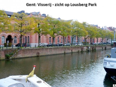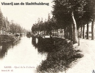 Op deze foto zie je het noordelijk deel van de Visserij vanaf de Slachthuisbrug, ook wel Gandabrug geheten. Rechts is er de met platanen beplante Visserij. Links de Lousbergskaai. Gans achteraan ziet men ook de Lousbergsbrug.