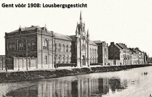 Op deze foto zien we het oorspronkelijke Lousbergsgesticht zoals het er uit zag voor het bouwen van de kaaimuren in 1908 en voor het in 1911-1912 werd uitgebreid en verminkt door architect Oscar Van de Voorde (1871-1938, de hoofdarchitekt van de Gentse Wereldtentoonstelling).