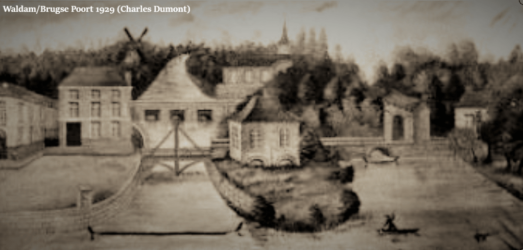 21 augustus 1893 “Openbare werken te Gent. De Waldam aan de Brugse poort is bijna geheel opgevuld. De draaiende brug is weggenomen en het publiek gaat over het opgevulde water. De eerste onroerende goederen zijn aangekocht.”