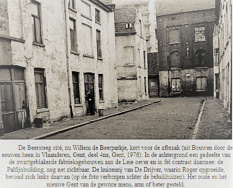 Daar lag ook een vrij groot beluik dat bekend stond als de cité van de Beersteeg. In de steeg zelf was er een schooltje dat gehouden werd door nonnen met kappen voorzien van grote wuivende zijlappen. Ik ging naar het stadsonderwijs, eerst in een houten schooltje in de Baudelohof, later naar het Laurentinstituut in de Onderstraat. Het was een kinderrijke buurt, één familie! Bijna iedereen had een lapnaam: de zievereire, de bloeneuze,… Met mijn wit haar was ik “den bloengten”. Het was er plezierig spelen … maar altijd eerst huiswerk maken. en als ma riep“Rosjeee”, moest ik alles laten vallen en onmiddellijk naar huis komen. Mijn ouders waren streng, maar rechtvaardig.