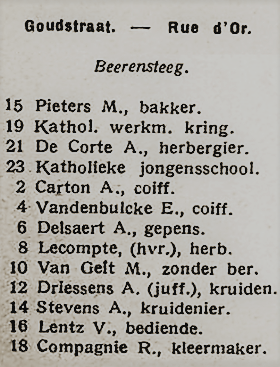 Vermelden we enkele “neringdoeners” en winkeltjes gelegen in de “Beerensteeg” dd. 1929.